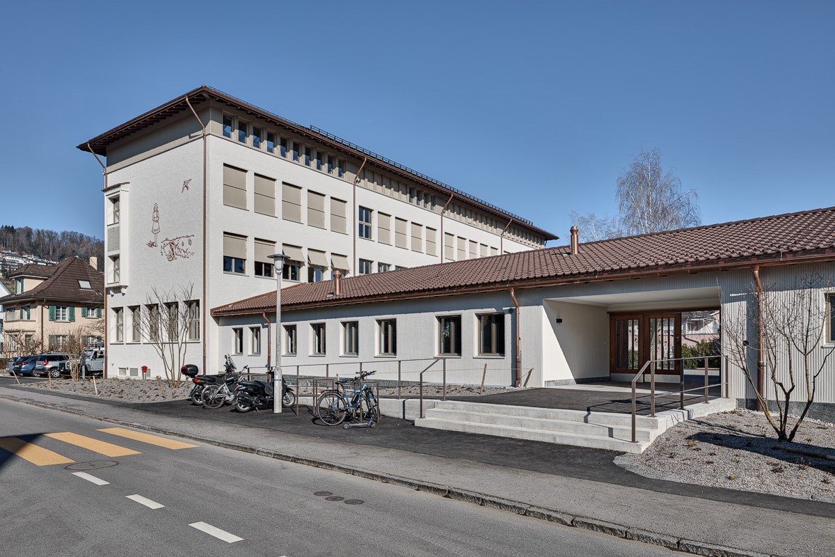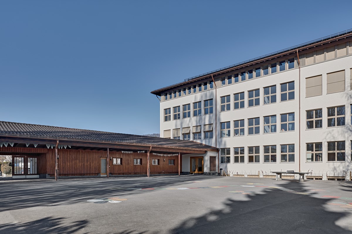 Das Schulhaus wurde zwischen 1950 und 1952 von den Krienser Architekten Otto Zeier, Fritz Hodel und Adolf Rüegg erbaut und ist als erhaltenswert im kantonalen Bauinventar eingestuft. Die Erweiterung und Gesamterneuerung erfolgte mit grossem Respekt gegenüber dem denkmalgeschützten Bestand. Durch den Ausbau des Dachgeschosses konnten zusätzliche Nutzflächen geschaffen und mit einer neuen Liftanlage alle Geschosse hindernisfrei erschlossen werden. Die moderate Dachanhebung stärkt die Präsenz des Gebäudes, ohne den städtebaulichen Kontext zu beeinträchtigen. Ein wirtschaftliches Innendämmkonzept ermöglichte die energetische Ertüchtigung bei Erhalt der bauzeitlichen Details. Parallel dazu wurden Erdbebenertüchtigungen, haustechnische Erneuerungen sowie umfassende Innen- und Aussensanierungen umgesetzt.