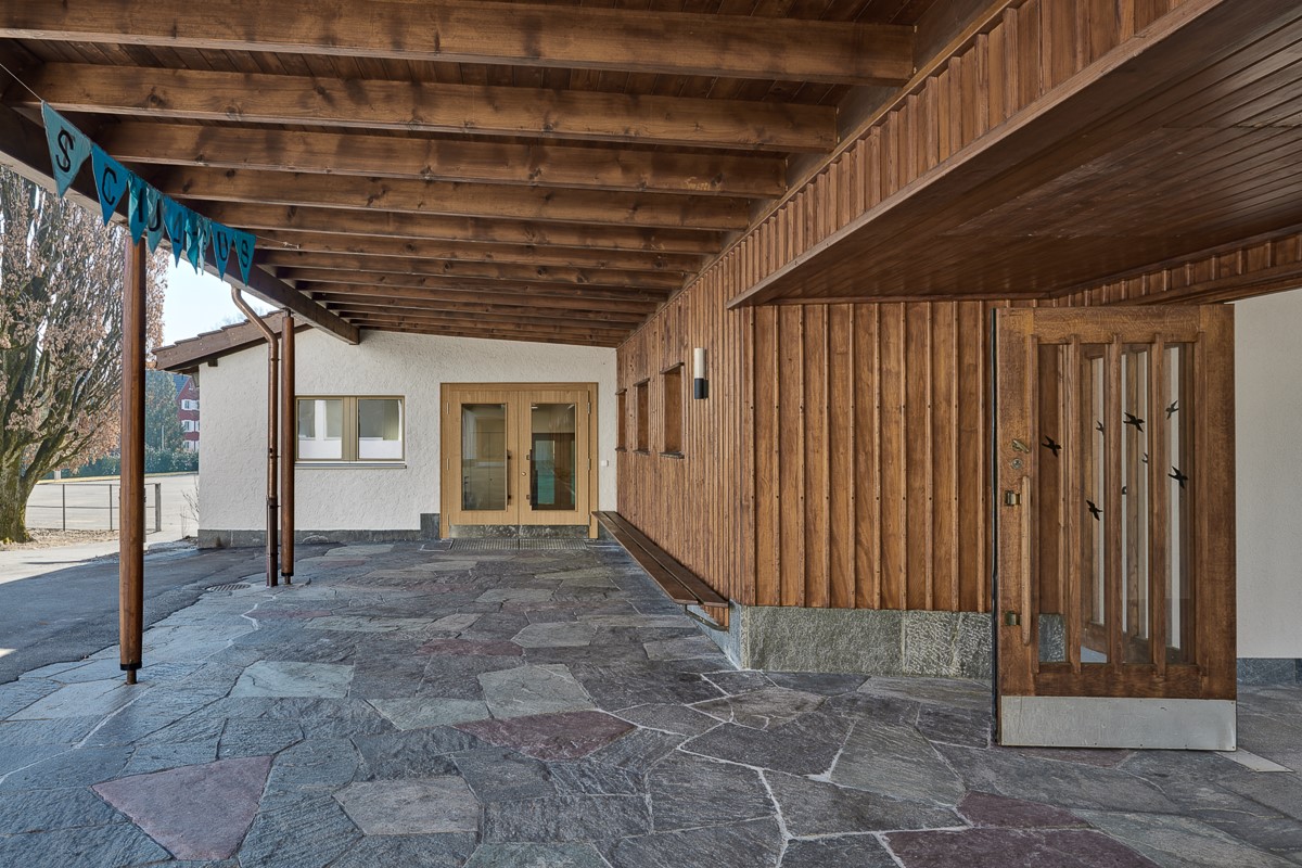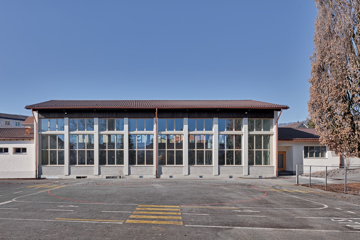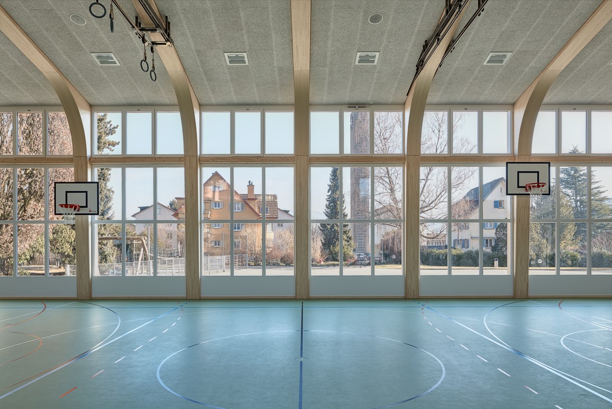 Auch die Turnhalle wurde vollständig saniert und BFU-konform ausgebaut. Der Erhalt des charakteristischen Holztragwerks, ergänzt durch statische Verstärkungen, bewahrt den ursprünglichen Charme und verbindet ihn mit zeitgemässem Komfort durch Schwingboden, Bodenheizung und neue Lüftung.