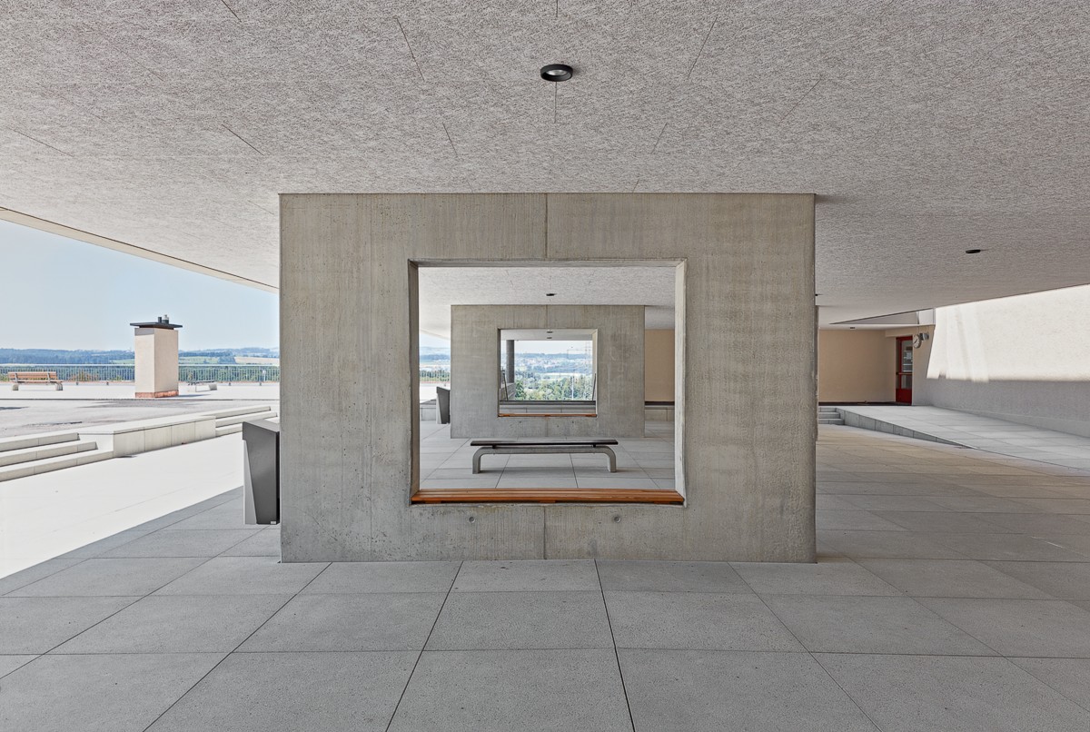 Die Erweiterung wurde aus funktionalen Gründen als Anbau konzipiert, löst sich städtebaulich jedoch bewusst vom bestehenden Sekundarschulgebäude und dockt an die Turnhalle an. Eine geschlossene Passerelle im ersten und zweiten Obergeschoss verbindet den Neubau mit der bestehenden Schule. Dadurch entsteht ein eigenständiger Baukörper, der sich zurückhaltend in das Ensemble einfügt und dem Pausenplatz ausreichend Raum lässt. Zur Sportanlage hin kragt das Volumen über den Terrainversatz aus und schafft einen gedeckten Zugang zwischen Schul- und Sportniveau. Ein grosszügiger Lichthof zwischen Neubau und Turnhalle sorgt für optimale Tageslichtverhältnisse im Innern sowie für eine gute Belichtung des gedeckten Pausenplatzes. Die horizontale Gliederung der Fassade, geprägt durch raumhohe Verglasungen und Flachdach, verleiht dem Bau eine eigenständige architektonische Sprache. Im Innern fördern helle Schulzimmer, grosszügige Korridore und vielfältige Sichtbezüge Begegnung, Orientierung und Aufenthaltsqualität.