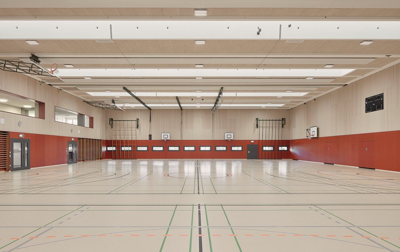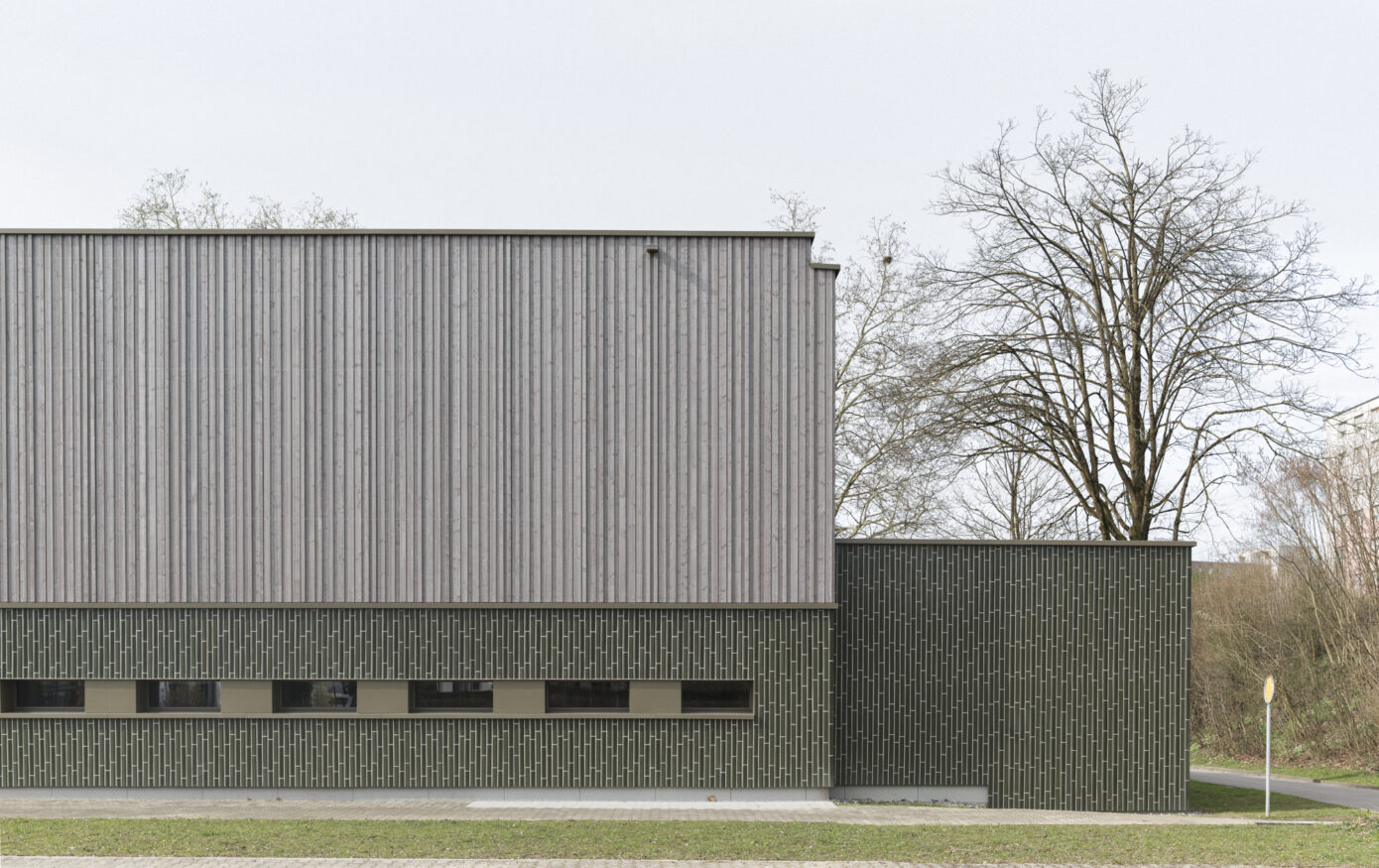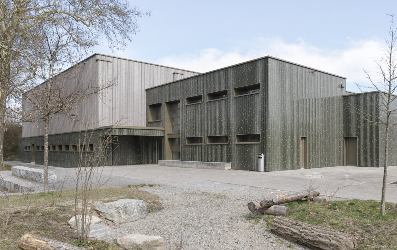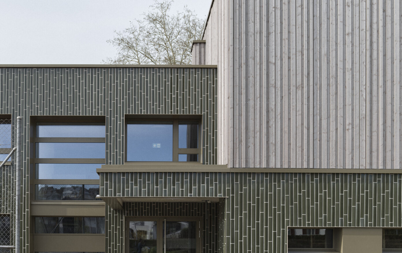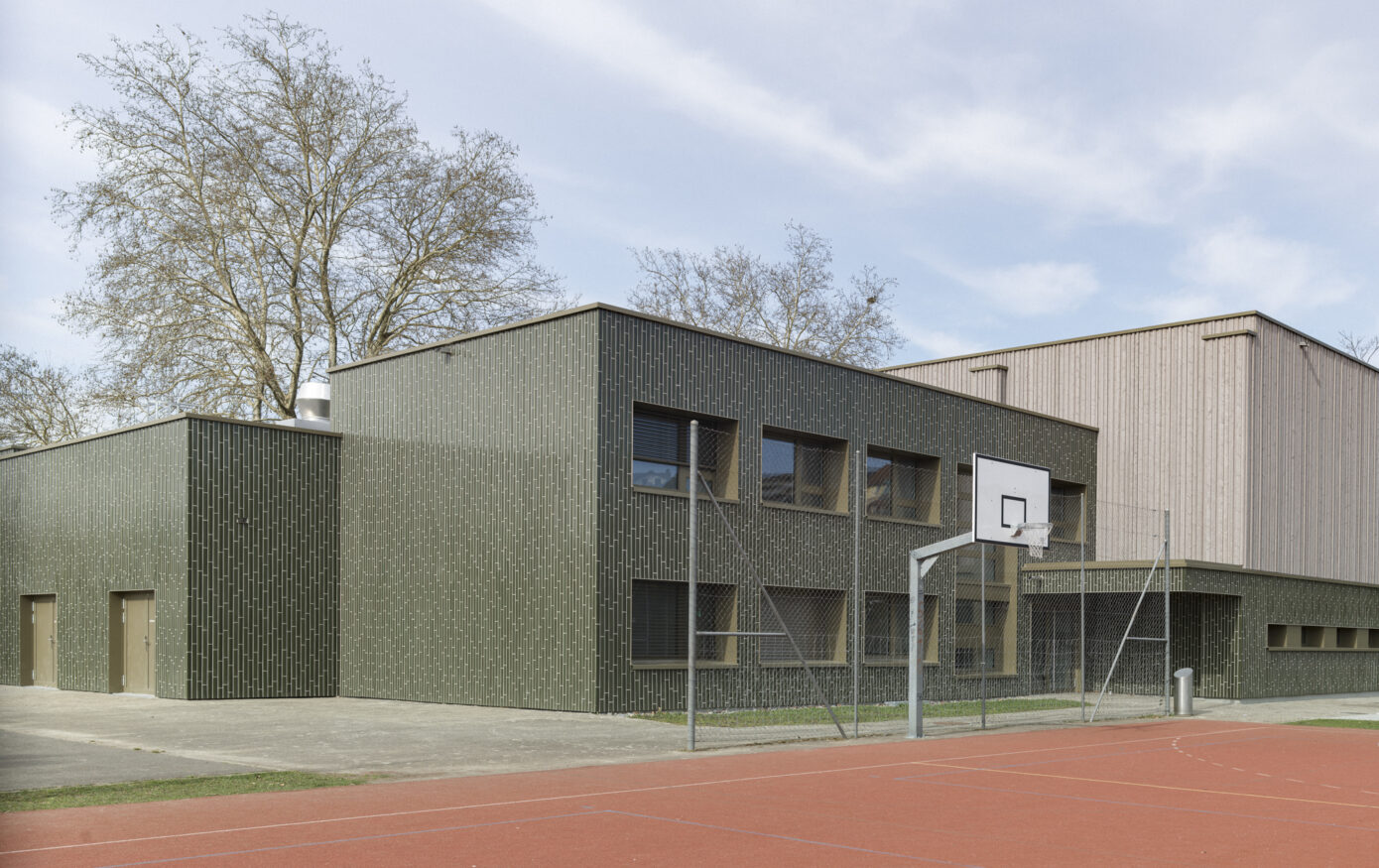 Die Dreifachturnhalle Junkholz in Wohlen wurde 1973 als Betonelementbau realisiert und gliedert sich in die zentrale Halle, nördliche Geräteräume sowie einen zweigeschossigen Garderoben- und Eingangsbereich mit Zuschauertribüne. Ziel der Sanierung war es, das Gebäude energetisch, baulich und funktional auf einen zeitgemässen Stand zu bringen und gleichzeitig den Schulbetrieb möglichst wenig zu beeinträchtigen. Aufgrund der konstruktiven Struktur wurde eine abgekoppelte, hinterlüftete Fassade umgesetzt. Sockel, Geräteräume und Garderobentrakt erhielten eine robuste Keramikfassade, während die obere Hallenzone mit einer vertikalen Holzschalung das Volumen massstäblich gliedert. Im Innern standen neue Oberflächen, Einbauten sowie die Erfüllung von Brandschutz-, BFU- und Behindertenanforderungen im Fokus. Die technische Infrastruktur wurde vollständig erneuert, eine Photovoltaikanlage ergänzt und das Gebäude schadstofffrei gemacht. Mit der Gesamtsanierung erreichte die Turnhalle eine MINERGIE-Neubau-Zertifizierung.