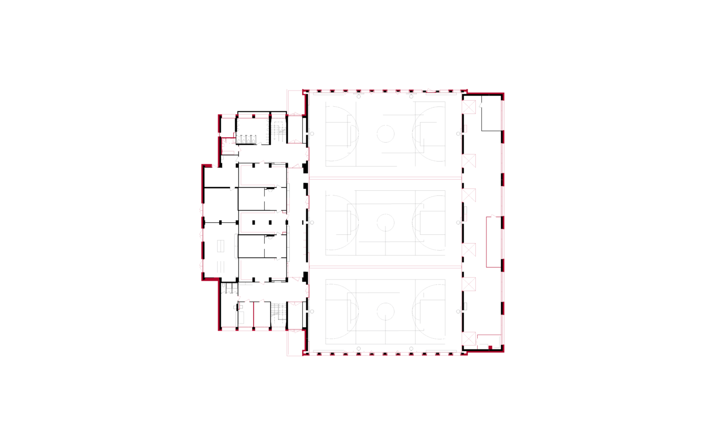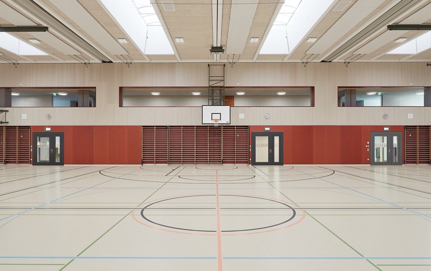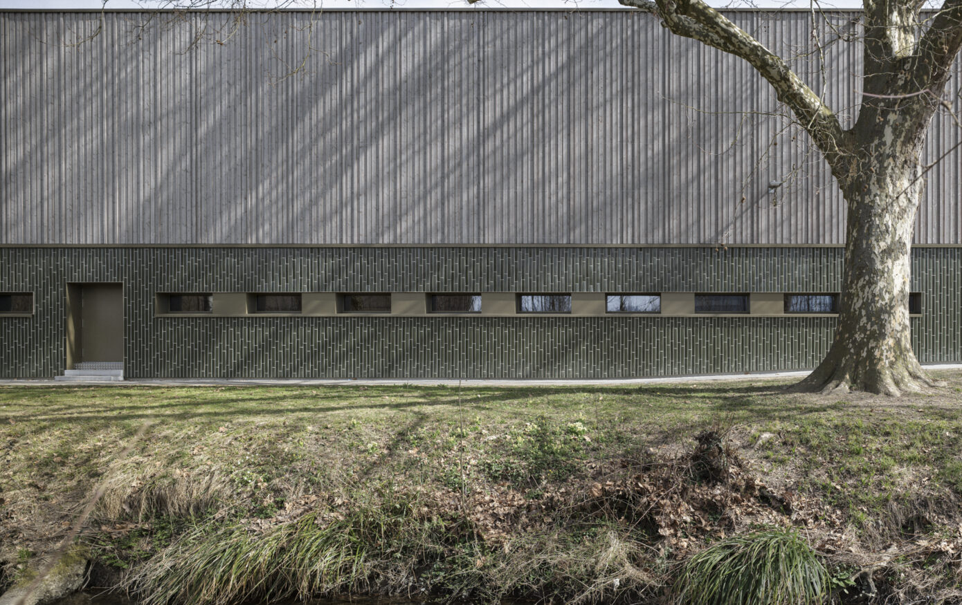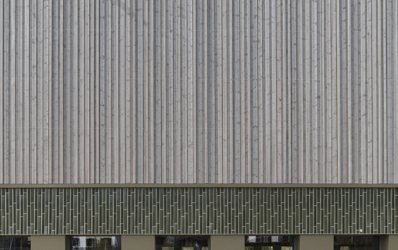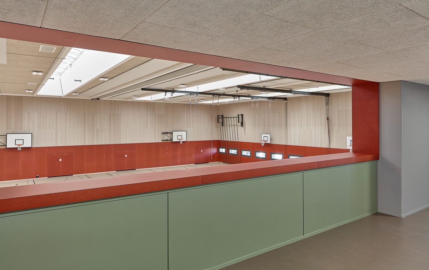 Die Dreifachturnhalle Junkholz in Wohlen wurde 1973 als Betonelementbau realisiert und gliedert sich in die zentrale Halle, nördliche Geräteräume sowie einen zweigeschossigen Garderoben- und Eingangsbereich mit Zuschauertribüne. Ziel der Sanierung war es, das Gebäude energetisch, baulich und funktional auf einen zeitgemässen Stand zu bringen und gleichzeitig den Schulbetrieb möglichst wenig zu beeinträchtigen. Aufgrund der konstruktiven Struktur wurde eine abgekoppelte, hinterlüftete Fassade umgesetzt. Sockel, Geräteräume und Garderobentrakt erhielten eine robuste Keramikfassade, während die obere Hallenzone mit einer vertikalen Holzschalung das Volumen massstäblich gliedert. Im Innern standen neue Oberflächen, Einbauten sowie die Erfüllung von Brandschutz-, BFU- und Behindertenanforderungen im Fokus. Die technische Infrastruktur wurde vollständig erneuert, eine Photovoltaikanlage ergänzt und das Gebäude schadstofffrei gemacht. Mit der Gesamtsanierung erreichte die Turnhalle eine MINERGIE-Neubau-Zertifizierung.